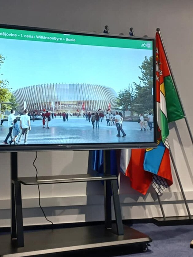 Hejtman Martin Kuba (vlevo) a náměstek primátorky Petr Maroš představují Centrum míčových sportů, které vyroste v Českých Budějovicích.