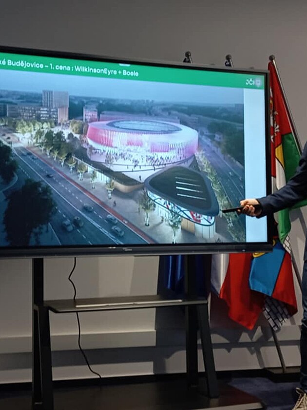 Hejtman Martin Kuba (vlevo) a náměstek primátorky Petr Maroš představují Centrum míčových sportů, které vyroste v Českých Budějovicích.