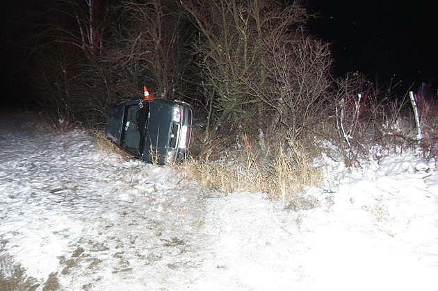 Mladík dostal na zledovatělé vozovce v pravotočivé zatáčce smyk a vyjel mimo silnici, kde poškodil pomníček z dřívější tragické nehody. Za krajnicí se auto převrátilo na pravý bok.