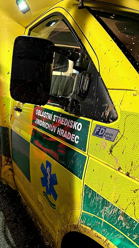 Po zásahu v poli byla sanitka pořádně zabahněná.