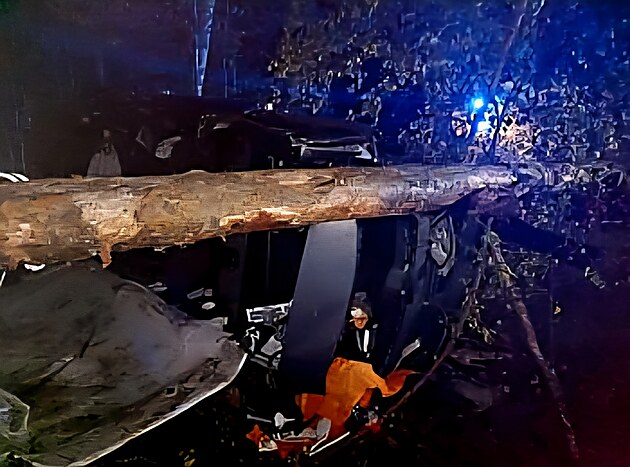 Všichni zasahující bojovali s velmi obtížným přístupem přes bažinu a přelomený strom až ke zraněnému řidiči. (10. 6. 2025)