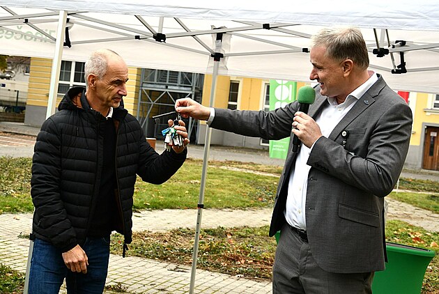 Ředitel budějovické nemocnice Michal Šnorek (vpravo) předal hejtmanovi Martinu Kubovi klíče od dolního areálu, který nemocnice definitivně opustila. Kraj tam teď začíná budovat Novou Lineckou čtvrť.