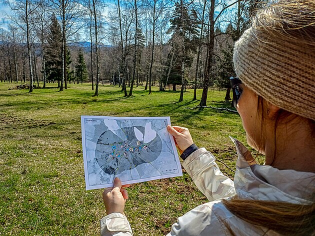 Mapka ukazuje, jak byly rozmístěné jednotlivé statky v Mladoňově. Teď jsou na jejich místech louky, kde se pasou zvířata.