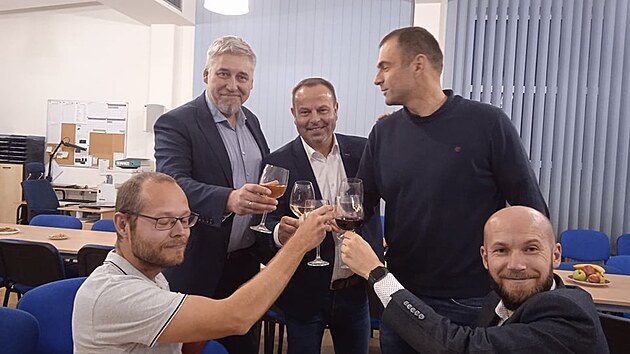 Oslavy ve štábu SPOLU v Budějovicích. Uprostřed jednička Jan Bauer (ODS)