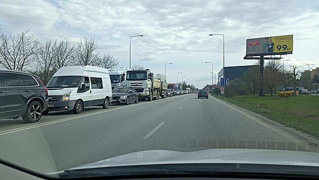 Kolona na výjezdu z Českých Budějovic. U sídliště Vltava ve směru na Písek. (14. dubna 2025)