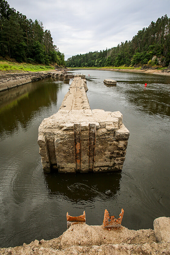 Zbytky Nového mlýna a jezu v původním korytě Vltavy.