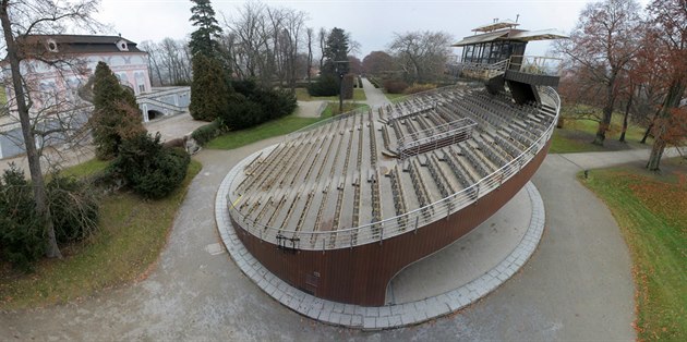 Otáčivé hlediště stojí uprostřed parku krumlovského zámku.