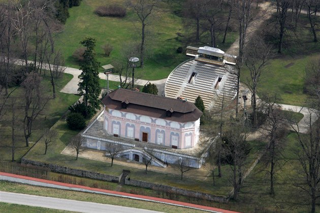 Letecký pohled na letohrádek, otáčivé hlediště a část zámecké zahrady