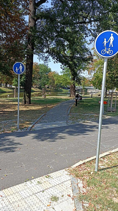 Park Dukelská v Budějovicích je plný značek, které ukazují, kde končí a začíná cyklostezka či stezka pro pěší. Tady jsou dvě od sebe ve vzdálenosti zhruba tří metrů. Působí to až směšně.