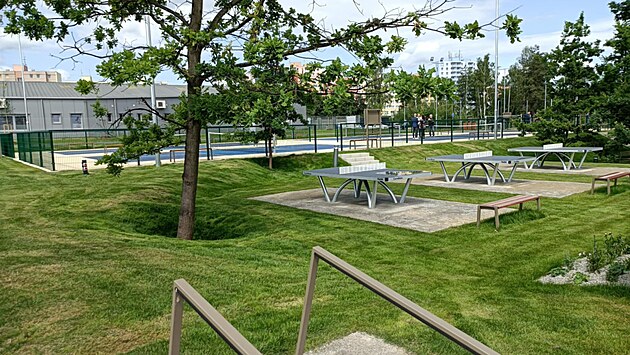 Druhá etapa ČEZ areálu Vltava v Budějovicích je hotová. Součástí jsou tři stoly na ping pong. (červen 2025)