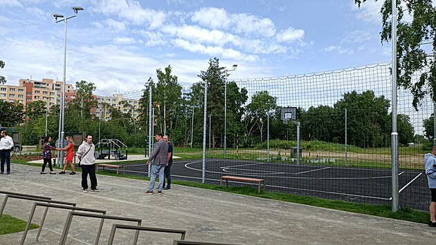 Druhá etapa ČEZ areálu Vltava v Budějovicích je hotová. Na snímku je hřiště na streetball, plácek pro seniory či nový kolostav. (červen 2025)