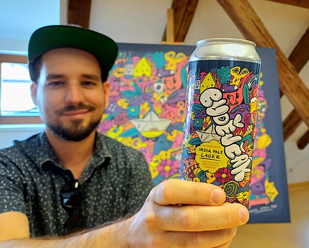 Daniel Kyncl (na snímku) plechovky nazdobil pestrobarevnou grafikou s lokálními tématy. (18. července 2025)