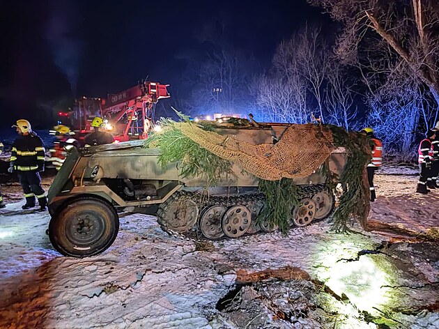 Havarované historické vozidlo vyprostili hasiči. (19. ledna 2025)