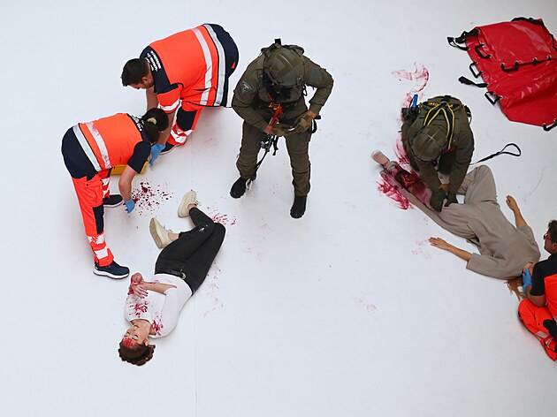 Mistrovství republiky zásahových jednotek začalo úvodní disciplínou v budějovickém IGY. Jednotlivé týmy musely za pomoci záchranářů zachránit napadené agentky. (22. září 2025)