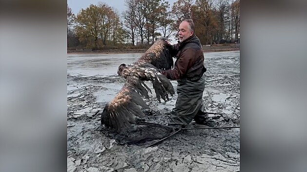 Z bahna vypuštěného rybníka zachránili orla mořského