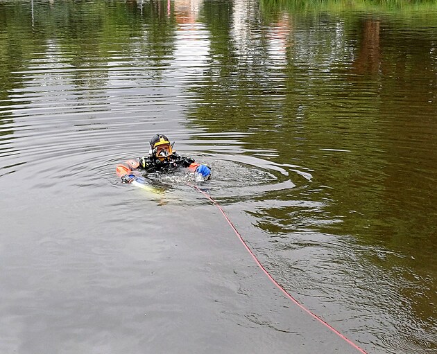 Řeku propátrávají i potápěči hasičů.