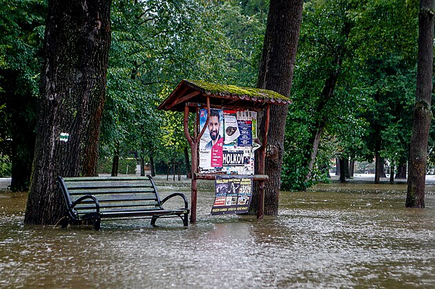 Obec Plav na Českobudějovicku zůstávala i v neděli z části zaplavená z řeky Malše. (15. září 2024)