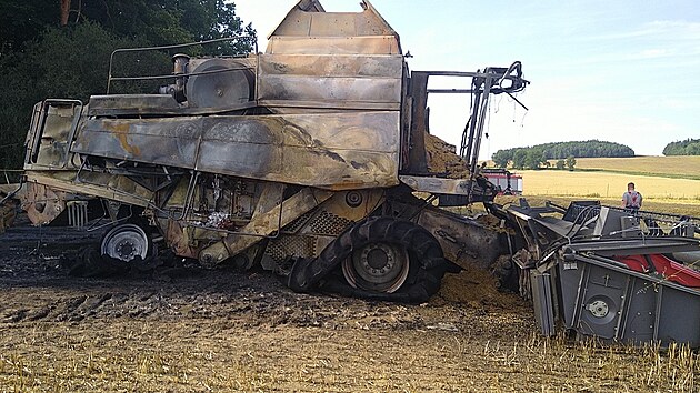 Na poli u obce Štěkře shořel v neděli kombajn. (20. července 2025)