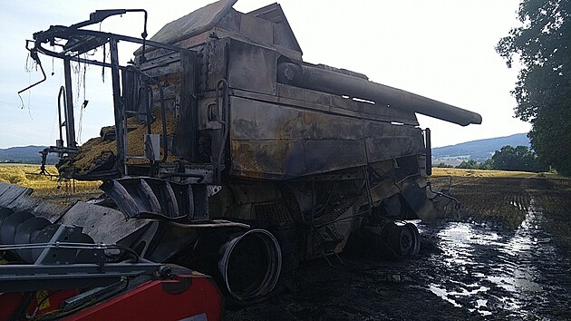 Na poli u obce Štěkře shořel v neděli kombajn. (20. července 2025)