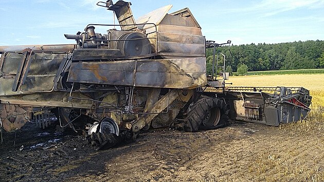 Na poli u obce Štěkře shořel v neděli kombajn. (20. července 2025)