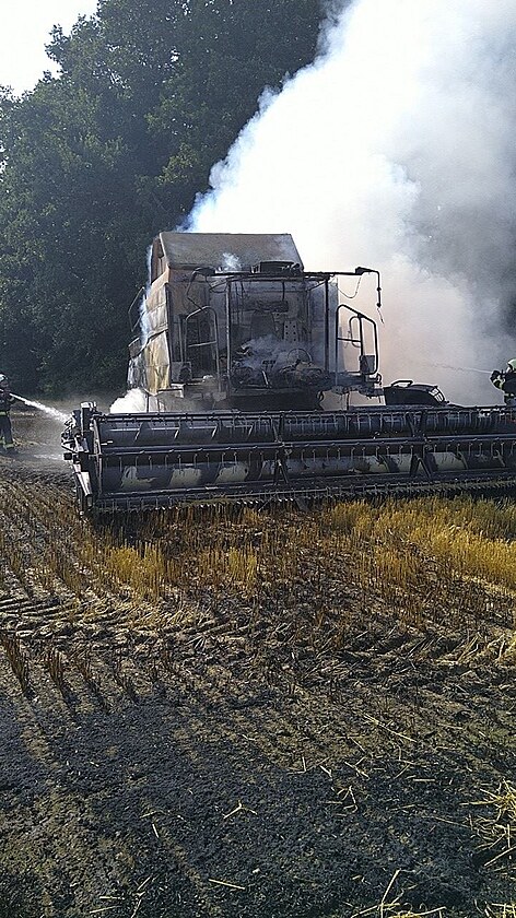 Na poli u obce Štěkře shořel v neděli kombajn. (20. července 2025)