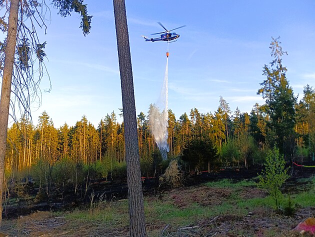 U obce Velký Ježov na Táborsku hořela lesní hrabanka. Požár zasáhl plochu zhruba dva hektary. Hasičům pomáhal policejní vrtulník s bambivakem. (29. dubna 2025)