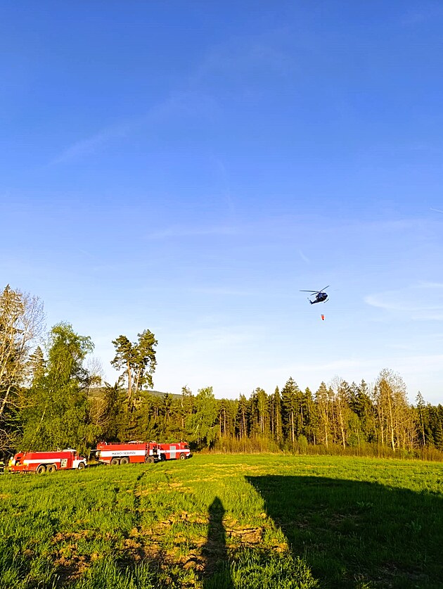 U obce Velký Ježov na Táborsku hořela lesní hrabanka. Požár zasáhl plochu zhruba dva hektary. Hasičům pomáhal policejní vrtulník s bambivakem. (29. dubna 2025)