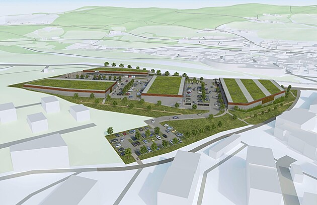 Retail park chce postavit společnost Portin. Na obrázku je předběžná vizualizace, která ještě dozná změn. (prosinec 2025)