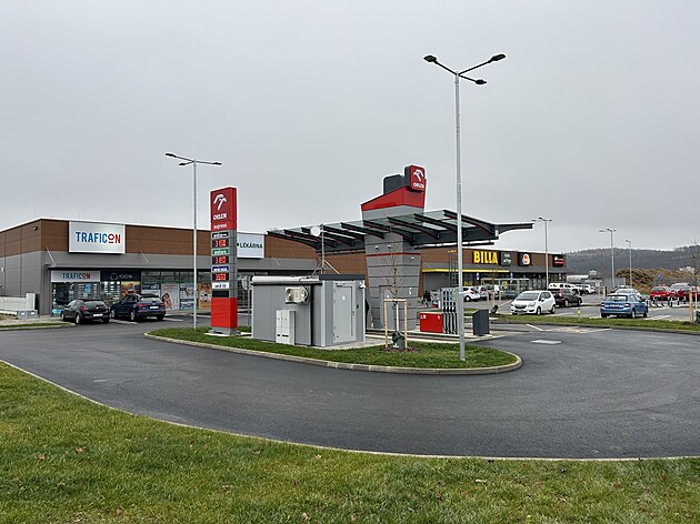 Retail Park v Roudném na Českobudějovicku má i čerpací stanici. (prosinec 2025)