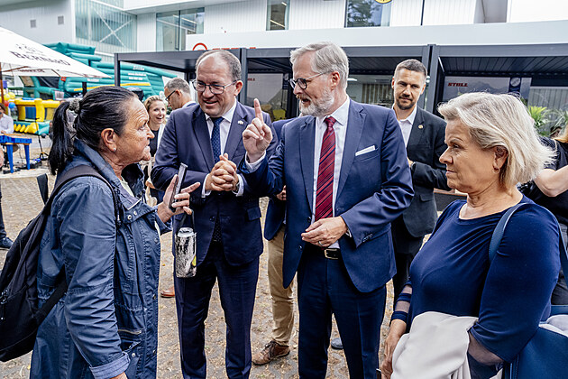 Premiér Petr Fiala si na akci Země živitelka od jedné ženy na akci vyslechl kritiku kvůli nízkému navýšení důchodů. Na fotce ministr zemědělství Marek Výborný (vlevo), a europoslankyně Veronika Vrecionová (ODS). (21. srpna 2025)