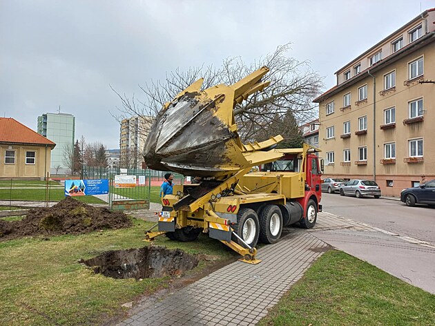 Ve Strakonicích poprvé vyzkoušeli přesazování vzrostlých stromů. Čtyři habry stěhovali od školy k tenisové hale. (1. dubna 2025)