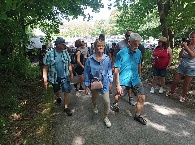 Prezident s manželkou vyrazili s doprovodem z parkoviště nad Krásetínem směr Kleť. Eva Pavlová na vrchol vyjela lanovkou. (18. července 2023)