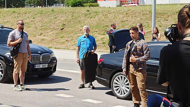 Na letišti se prezident Petr Pavel i členové jeho ochranky převlékli do sportovního a vyrazili pod Kleť. Na nejvyšší vrchol Blanského lesa se vydali pěšky pod lanovkou. (18. července 2023)