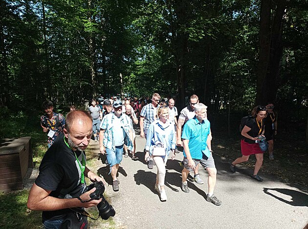 Prezident s manželkou vyrazili s doprovodem z parkoviště nad Krásetínem směr Kleť. Eva Pavlová na vrchol vyjela lanovkou. (18. července 2023)