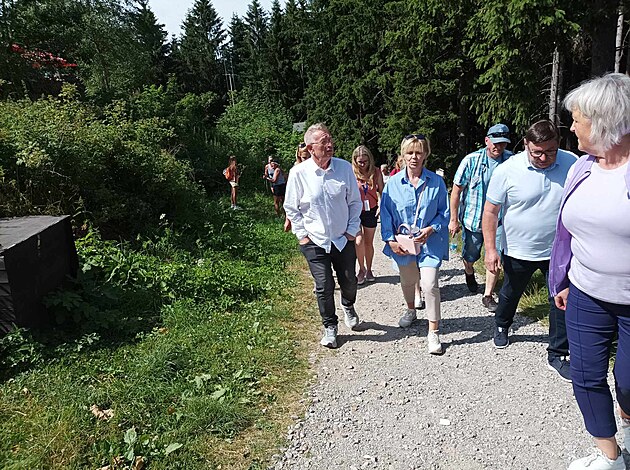 Evu Pavlovou doprovodili na Kleti majitel tamní rozhledny a jihočeský senátor Ladislav Faktor a náměstek hejtmana Pavel Hroch. (18. července 2023)