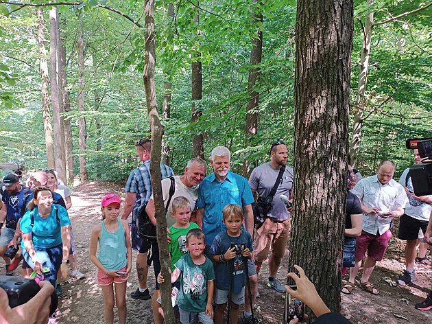 Prezidenta Petra Pavla obklopil na Kleti dav turistů. Na vrchol vystoupal za 40 minut. Cestou se fotil se svými příznivci. (18. července 2023)