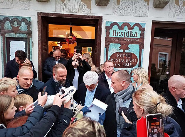 Prezident Petr Pavel se na náměstí ve Slavonicích podepisoval školákům na tenisky.