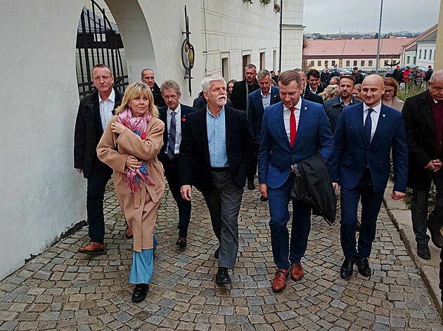 Prezident Petr Pavel se po přivítání na dačické radnici vydal procházkou přes město na oběd do restaurace. Doprovázela ho manželka Eva, předseda Senátu Miloš Vystrčil i dačický starosta Miloš Novák.