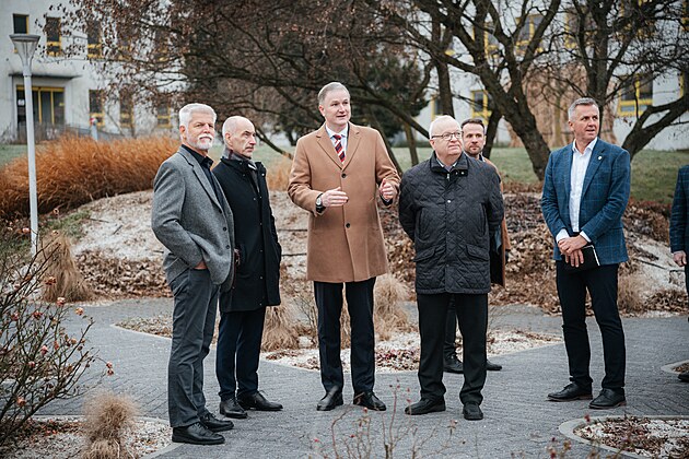 Petr Pavel si v doprovodu hejtmana Martina Kuby a ředitele nemocnice Michala Šnorka prošel park, který je součástí areálu nemocnice. (14. ledna 2025)
