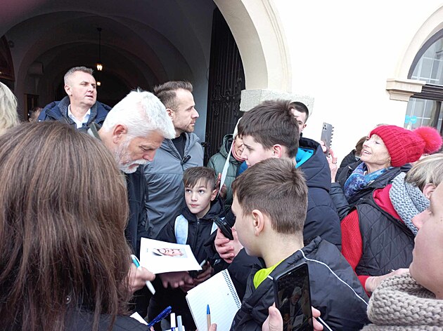 Před radnicí v Nových Hradech se prezident podepisoval lidem, kteří na něj čekali.