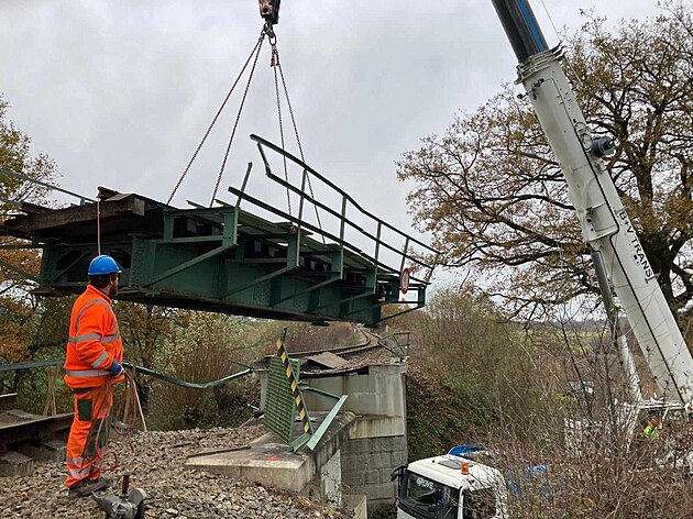 Dělníci za pomoci jeřábu odstranili most u Čimelic, který poškodil náraz nákladního auta. Jeho řidič chtěl pod ním projet, ale nevešel se.