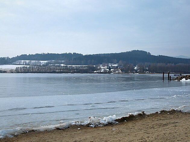 Na zamrzlé Lipno lidé najíždějí z hornoplánské pláže a vyjíždějí v Bližší Lhotě u břehu mezi stromy (na snímku vlevo).