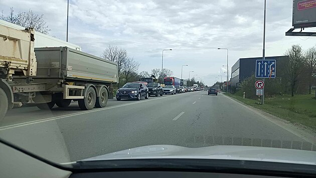 Kolona na výjezdu z Českých Budějovic. U sídliště Vltava ve směru na Písek. (14. dubna 2025)