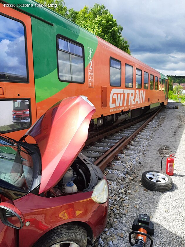 Na přejezdu v Kájově se střetl osobní vlak se Škodou Fabia. (19. května 2025)