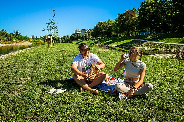 Nová odpočinková zóna v Českých Budějovicích u řeky Vltavy se jmenuje Sluneční ostrov. (19. srpna 2025).
