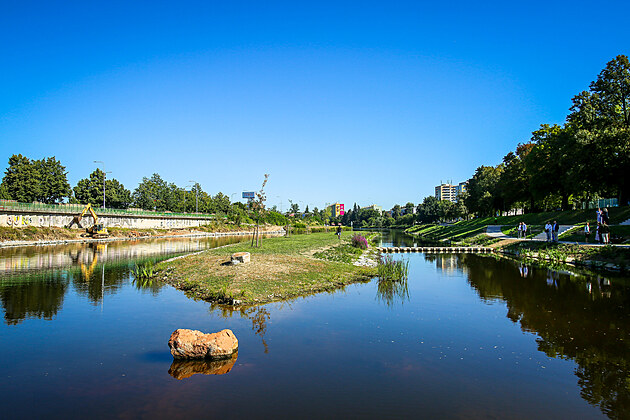 Nová odpočinková zóna v Českých Budějovicích u řeky Vltavy se jmenuje Sluneční ostrov. (19. srpna 2025).