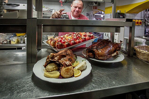 Šéfkuchař Luděk Hauser v Masných krámech v Českých Budějovicích připravuje na stůl svatomartinskou husu. Ve známé restauraci měli už koncem pracovního týdne stovky rezervací.