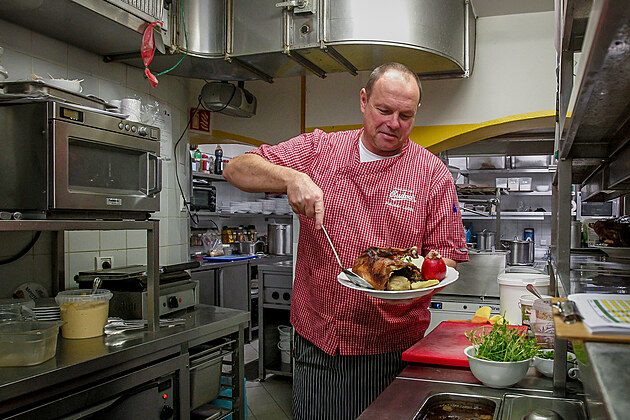 Šéfkuchař Luděk Hauser v Masných krámech v Českých Budějovicích připravuje na stůl svatomartinskou husu. Ve známé restauraci měli už koncem pracovního týdne stovky rezervací.