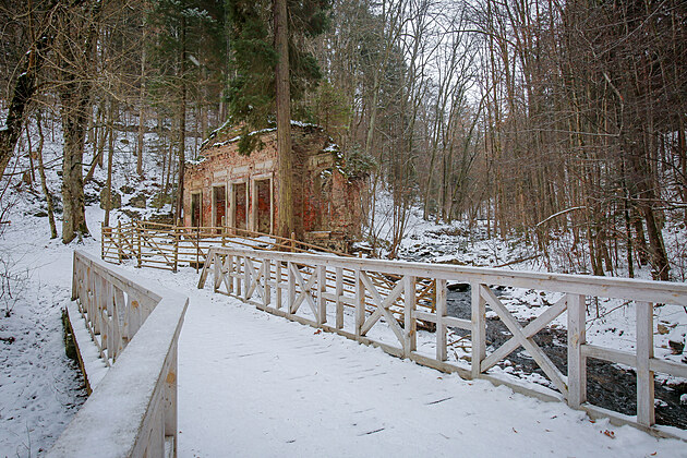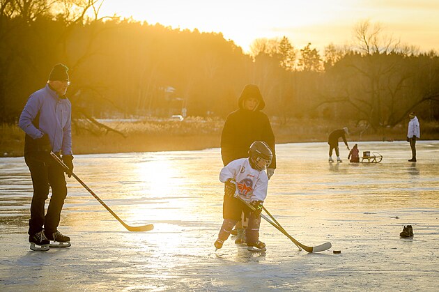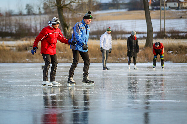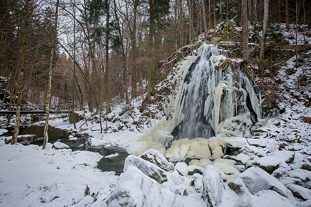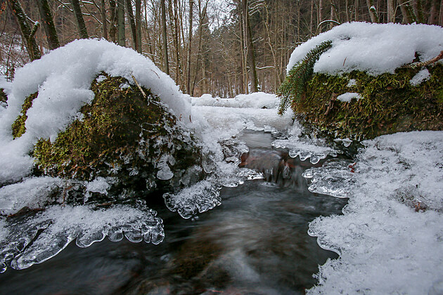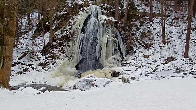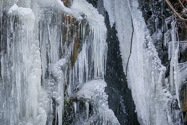 První dny roku 2026 přinesly zimní počasí, které dovoluje bruslení na rybnících či pomalu zamrzá uměle vytvořený vodopád v Terčině Údolí na Novohradsku. (7. ledna 2026)