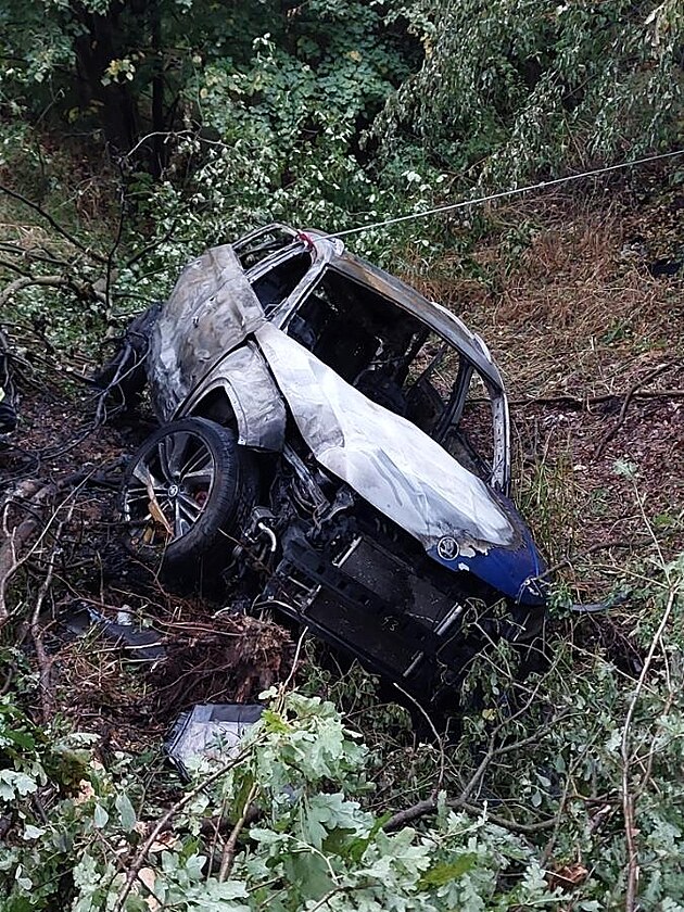 Auto vyletělo ze silnice a začalo hořet. Řidiče našli mrtvého pod vozem. (2. září 2025)